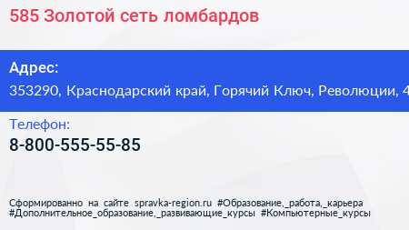 585*Золотой, сеть ломбардов по адресу 353290, Краснодарский край, Горячий Ключ, Революции, 4 в дальнейшем Организация, размещена в следующих категориях: