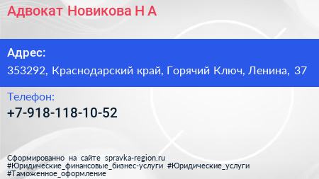 Адвокат Новикова Н.А. по адресу 353292, Краснодарский край, Горячий Ключ, Ленина, 37 в дальнейшем Организация, размещена в следующих категориях: