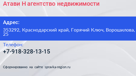 Атави+Н, агентство недвижимости по адресу 353292, Краснодарский край, Горячий Ключ, Ворошилова, 25 в дальнейшем Организация, размещена в следующих категориях: