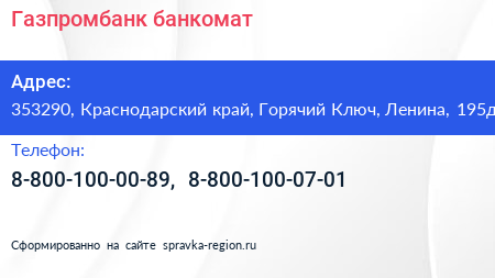 Газпромбанк, банкомат по адресу 353290, Краснодарский край, Горячий Ключ, Ленина, 195д в дальнейшем Организация, размещена в следующих категориях: