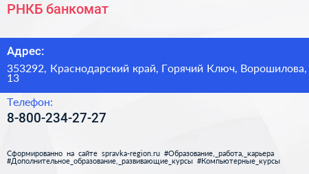 РНКБ, банкомат по адресу 353292, Краснодарский край, Горячий Ключ, Ворошилова, 13 в дальнейшем Организация, размещена в следующих категориях: