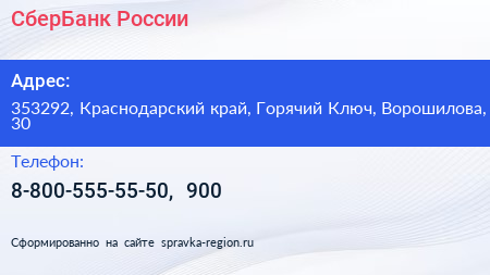 СберБанк России по адресу 353292, Краснодарский край, Горячий Ключ, Ворошилова, 30 в дальнейшем Организация, размещена в следующих категориях: