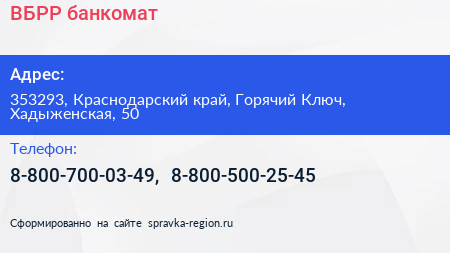 ВБРР, банкомат по адресу 353293, Краснодарский край, Горячий Ключ, Хадыженская, 50 в дальнейшем Организация, размещена в следующих категориях: