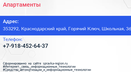 Апартаменты по адресу 353292, Краснодарский край, Горячий Ключ, Школьная, 36 в дальнейшем Организация, размещена в следующих категориях:
