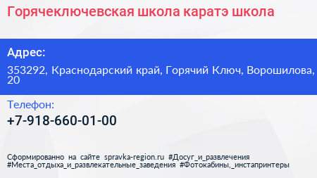 Горячеключевская школа каратэ, школа по адресу 353292, Краснодарский край, Горячий Ключ, Ворошилова, 20 в дальнейшем Организация, размещена в следующих категориях: