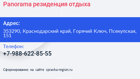 Panorama, резиденция отдыха по адресу 353290, Краснодарский край, Горячий Ключ, Псекупская, 151 в дальнейшем Организация, размещена в следующих категориях: