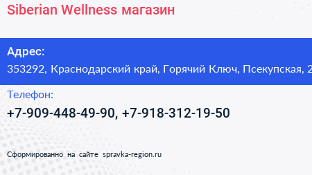 Siberian Wellness, магазин по адресу 353292, Краснодарский край, Горячий Ключ, Псекупская, 2 в дальнейшем Организация, размещена в следующих категориях: