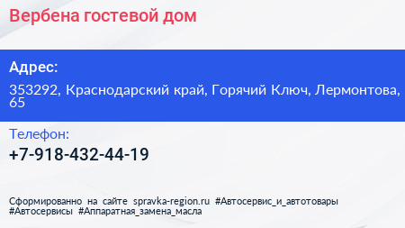 Вербена, гостевой дом по адресу 353292, Краснодарский край, Горячий Ключ, Лермонтова, 65 в дальнейшем Организация, размещена в следующих категориях: