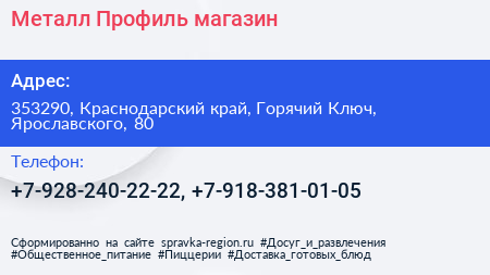 Металл Профиль, магазин по адресу 353290, Краснодарский край, Горячий Ключ, Ярославского, 80 в дальнейшем Организация, размещена в следующих категориях: