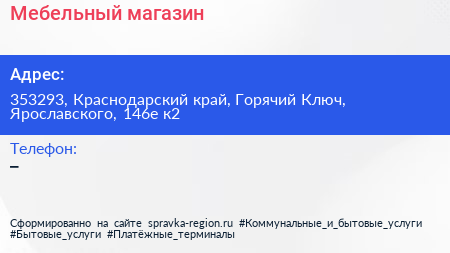 Мебельный магазин по адресу 353293, Краснодарский край, Горячий Ключ, Ярославского, 146е к2 в дальнейшем Организация, размещена в следующих категориях: