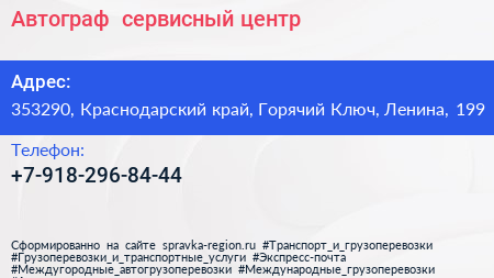 Автограф+, сервисный центр по адресу 353290, Краснодарский край, Горячий Ключ, Ленина, 199 в дальнейшем Организация, размещена в следующих категориях: