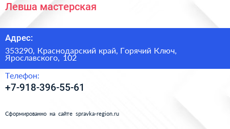 Левша, мастерская по адресу 353290, Краснодарский край, Горячий Ключ, Ярославского, 102 в дальнейшем Организация, размещена в следующих категориях: