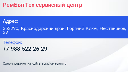 РемБытТех, сервисный центр по адресу 353290, Краснодарский край, Горячий Ключ, Нефтяников, 39 в дальнейшем Организация, размещена в следующих категориях: