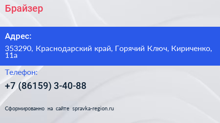 Брайзер+ по адресу 353290, Краснодарский край, Горячий Ключ, Кириченко, 11а в дальнейшем Организация, размещена в следующих категориях:
