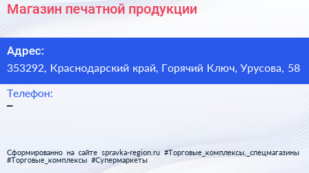 Магазин печатной продукции по адресу 353292, Краснодарский край, Горячий Ключ, Урусова, 58 в дальнейшем Организация, размещена в следующих категориях: