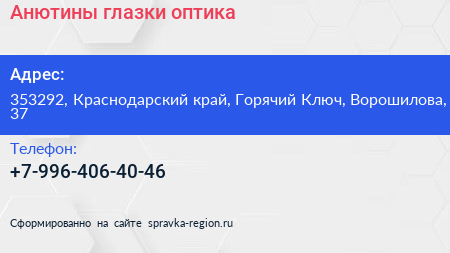 Анютины глазки, оптика по адресу 353292, Краснодарский край, Горячий Ключ, Ворошилова, 37 в дальнейшем Организация, размещена в следующих категориях: