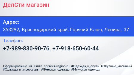 ДелСти, магазин по адресу 353292, Краснодарский край, Горячий Ключ, Ленина, 37 в дальнейшем Организация, размещена в следующих категориях: