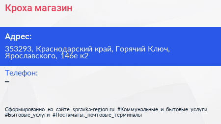 Кроха, магазин по адресу 353293, Краснодарский край, Горячий Ключ, Ярославского, 146е к2 в дальнейшем Организация, размещена в следующих категориях: