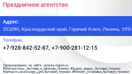 Праздничное агентство по адресу 353290, Краснодарский край, Горячий Ключ, Ленина, 195г в дальнейшем Организация, размещена в следующих категориях: