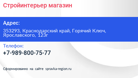 Стройинтерьер, магазин по адресу 353293, Краснодарский край, Горячий Ключ, Ярославского, 123г в дальнейшем Организация, размещена в следующих категориях: