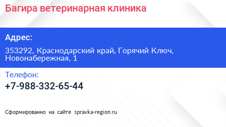Багира, ветеринарная клиника по адресу 353292, Краснодарский край, Горячий Ключ, Новонабережная, 1 в дальнейшем Организация, размещена в следующих категориях: