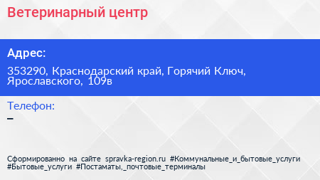 Ветеринарный центр по адресу 353290, Краснодарский край, Горячий Ключ, Ярославского, 109в в дальнейшем Организация, размещена в следующих категориях: