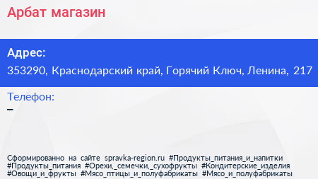 Арбат, магазин по адресу 353290, Краснодарский край, Горячий Ключ, Ленина, 217 в дальнейшем Организация, размещена в следующих категориях: