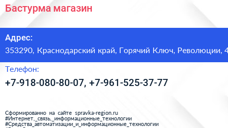 Бастурма, магазин по адресу 353290, Краснодарский край, Горячий Ключ, Революции, 4 в дальнейшем Организация, размещена в следующих категориях: