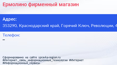Ермолино, фирменный магазин по адресу 353290, Краснодарский край, Горячий Ключ, Революции, 4 в дальнейшем Организация, размещена в следующих категориях: