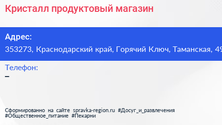 Кристалл, продуктовый магазин по адресу 353273, Краснодарский край, Горячий Ключ, Таманская, 49 в дальнейшем Организация, размещена в следующих категориях: