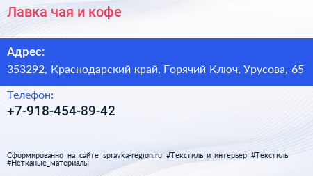 Лавка чая и кофе по адресу 353292, Краснодарский край, Горячий Ключ, Урусова, 65 в дальнейшем Организация, размещена в следующих категориях: