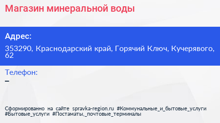 Магазин минеральной воды по адресу 353290, Краснодарский край, Горячий Ключ, Кучерявого, 62 в дальнейшем Организация, размещена в следующих категориях: