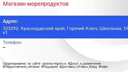 Магазин морепродуктов по адресу 353292, Краснодарский край, Горячий Ключ, Школьная, 19 к1 в дальнейшем Организация, размещена в следующих категориях:
