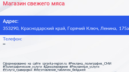 Магазин свежего мяса по адресу 353290, Краснодарский край, Горячий Ключ, Ленина, 175а в дальнейшем Организация, размещена в следующих категориях: