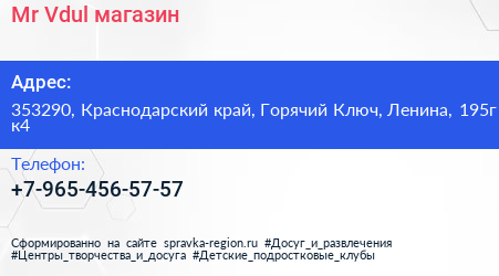 Mr.Vdul, магазин по адресу 353290, Краснодарский край, Горячий Ключ, Ленина, 195г к4 в дальнейшем Организация, размещена в следующих категориях: