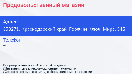 Продовольственный магазин по адресу 353271, Краснодарский край, Горячий Ключ, Мира, 34Б в дальнейшем Организация, размещена в следующих категориях: