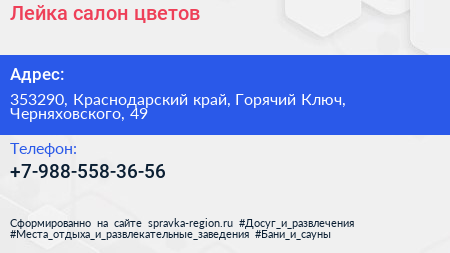Лейка, салон цветов по адресу 353290, Краснодарский край, Горячий Ключ, Черняховского, 49 в дальнейшем Организация, размещена в следующих категориях: