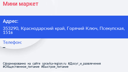 Мини-маркет по адресу 353290, Краснодарский край, Горячий Ключ, Псекупская, 151в в дальнейшем Организация, размещена в следующих категориях: