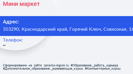 Мини-маркет по адресу 353290, Краснодарский край, Горячий Ключ, Совхозная, 16 в дальнейшем Организация, размещена в следующих категориях: