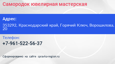 Самородок, ювелирная мастерская по адресу 353292, Краснодарский край, Горячий Ключ, Ворошилова, 20 в дальнейшем Организация, размещена в следующих категориях: