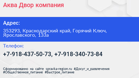 Аква Двор, компания по адресу 353293, Краснодарский край, Горячий Ключ, Ярославского, 133а в дальнейшем Организация, размещена в следующих категориях: