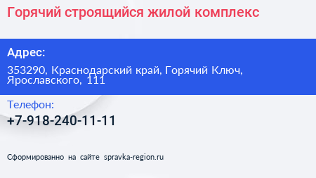 Горячий, строящийся жилой комплекс по адресу 353290, Краснодарский край, Горячий Ключ, Ярославского, 111 в дальнейшем Организация, размещена в следующих категориях: