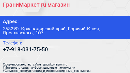 ГраниМаркет.ru, магазин по адресу 353290, Краснодарский край, Горячий Ключ, Ярославского, 107 в дальнейшем Организация, размещена в следующих категориях: