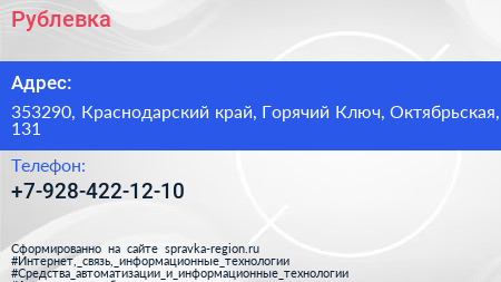 Рублевка по адресу 353290, Краснодарский край, Горячий Ключ, Октябрьская, 131 в дальнейшем Организация, размещена в следующих категориях: