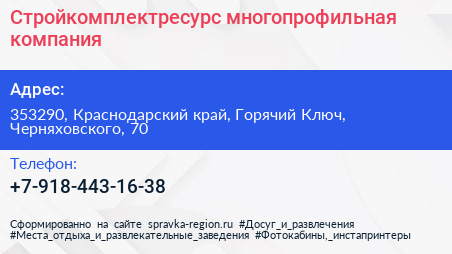 Стройкомплектресурс, многопрофильная компания по адресу 353290, Краснодарский край, Горячий Ключ, Черняховского, 70 в дальнейшем Организация, размещена в следующих категориях: