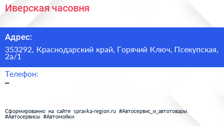 Иверская часовня по адресу 353292, Краснодарский край, Горячий Ключ, Псекупская, 2а/1 в дальнейшем Организация, размещена в следующих категориях: