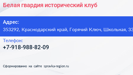 Белая гвардия, исторический клуб по адресу 353292, Краснодарский край, Горячий Ключ, Школьная, 33 в дальнейшем Организация, размещена в следующих категориях: