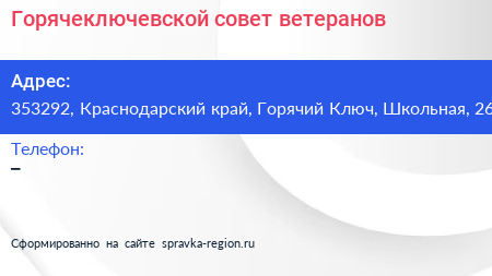 Горячеключевской совет ветеранов по адресу 353292, Краснодарский край, Горячий Ключ, Школьная, 26 в дальнейшем Организация, размещена в следующих категориях: