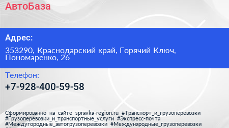 АвтоБаза по адресу 353290, Краснодарский край, Горячий Ключ, Пономаренко, 26 в дальнейшем Организация, размещена в следующих категориях: