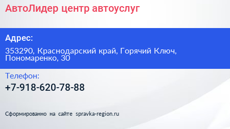 АвтоЛидер, центр автоуслуг по адресу 353290, Краснодарский край, Горячий Ключ, Пономаренко, 30 в дальнейшем Организация, размещена в следующих категориях: